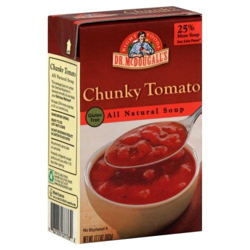 Dr. McDougall's Chunky Tomato Soup is a delicious source of lycopene. Enjoy it with a sandwich or hot crusty bread. They contain 90 calories and 34% Vitamin C. It is a tasty way to warm up with the wonderful flavor of tomato soup.You will not be disappointed with