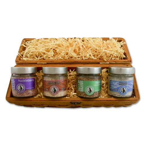 We've assembled a collection of 4 of our finest salts and sugars into one hinged basket for you. The sweet and salty basket box contains one 7 ounce jar of himalayan pink mineral salt, one 5.25 ounce jar of kosher flake mediterranean sea salt, one 6 ounce jar of all natural huckleberry infused sugar, and one 6 ounce jar of all natural apple cinnamon infused sugar. The himalayan salt is mined from the himalayan mountains and is full of minerals that give it a light flavor that goes well with vegetables, chicken, fish, and pork. The kosher flake salt is comprised of tiny pyramid shaped crystalline flakes of sea salt that allow it to provide more flavor with less sodium. The kosher flake salt goes well with steaks, chicken, pork, and also doubles nicely as a cocktail salt. Our all natural flavor infused sugars make great cocktail sugars, or can be used as sanding sugars for cookies, or as ingredients in rubs.You will not be disappointed with